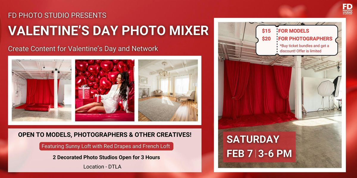 Join us on Saturday, Feb 7 from 3–6 PM at FD Photo Studio La Lofts for a Valentine’s Day–themed Photo Mixer! For this event, two decorated styled studios will be open and available for photo and video shoots.