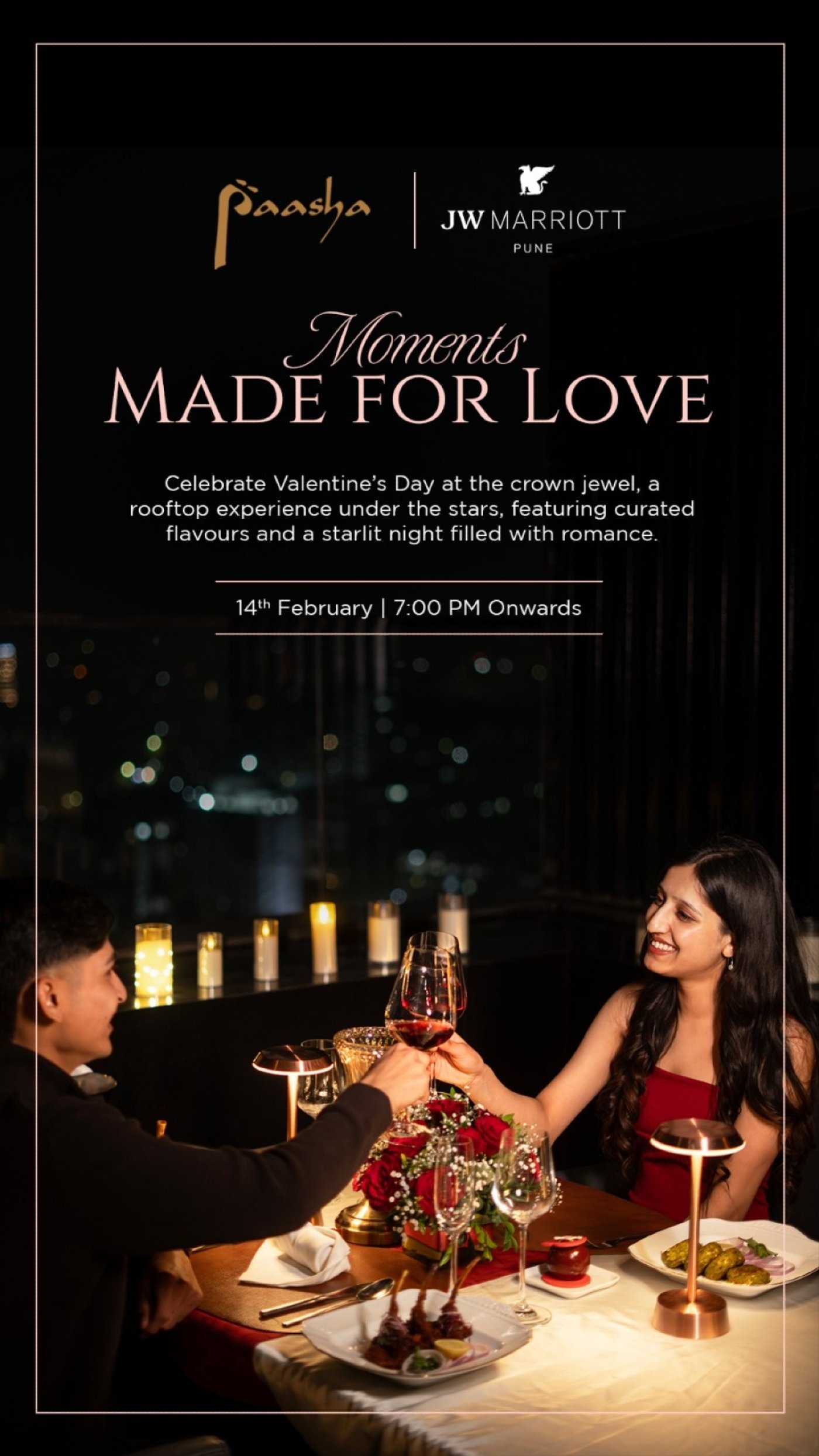Celebrate Valentine’s Day at Paasha, the crown jewel rooftop at JW Marriott Pune, where romance meets the skyline. Indulge in a thoughtfully curated set menu under the stars or in an elegant indoor setting, complemented by candlelight, elevated flavours, and sweeping city views. An unforgettable evening designed for intimacy and indulgence.