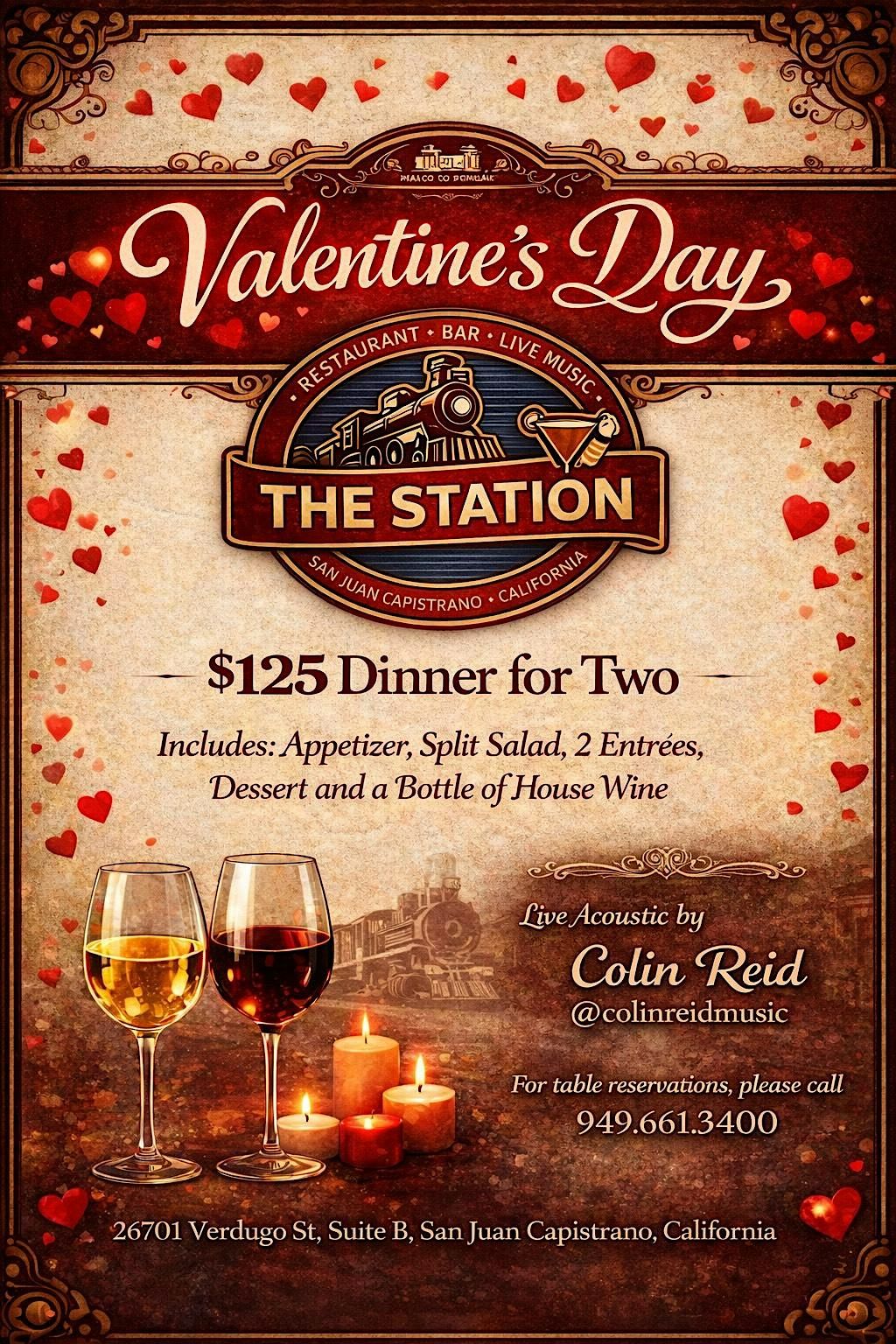 Join us at The Station for Valentine's Day. Dinner for two $125 includes 3 course dinner with dessert and a bottle of wine!
