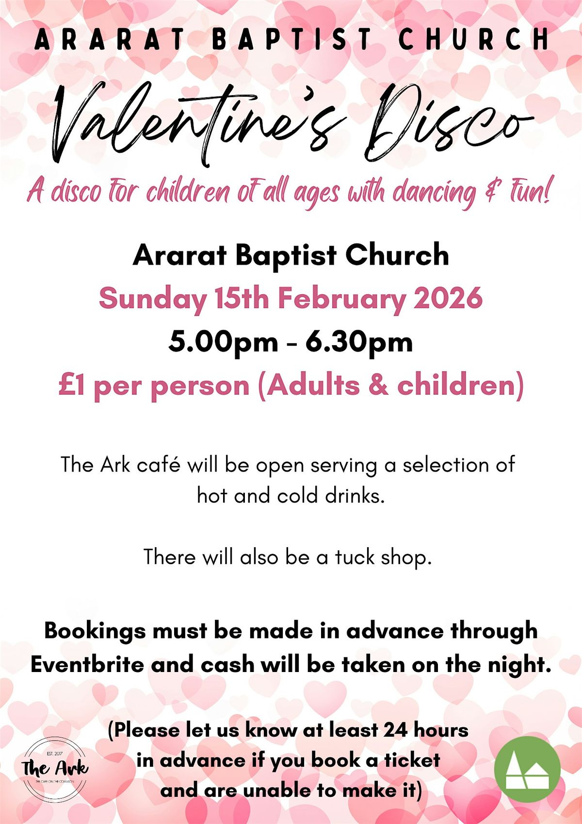 The Ark cafe will be open serving hot and cold drinks. A tuck shop will also be available.