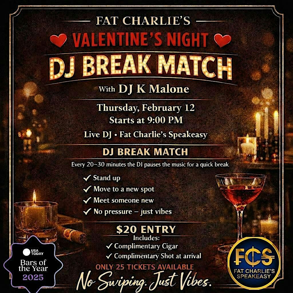 Get ready to dance your heart out at the coolest in-person event this Valentine's! The Valentines DJ Break Match is all about good vibes, great music, and meeting awesome people. Whether you're flying solo or bringing your crush, the energy will be 🔥. Don't miss the chance to spin, groove, and create unforgettable memories. Admission includes cigar and a drink.