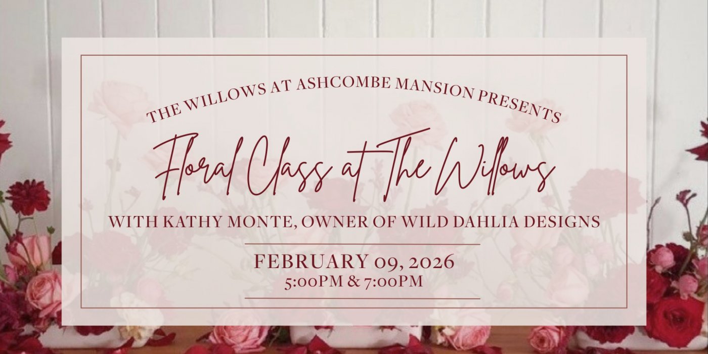 Join us for a romantic Valentine's evening of blooms and bubbles at The Willows at Ashcombe Mansion, in collaboration with Kathy Monte, owner of Wild Dahlia Designs!