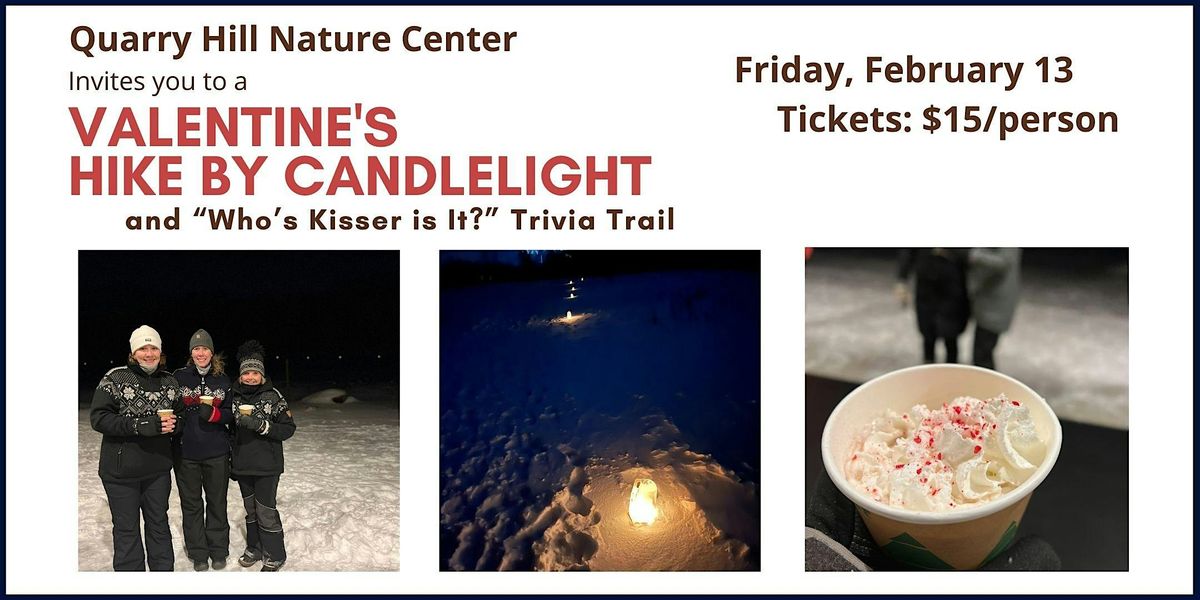 Follow the glow of candlelight through the woods as you walk the Valentine themed Who's Kisser Is It? animal trivia trail. Then, warm up by the fire inside the Nature Center. Enjoy an adult beverage from the gourmet hot cocoa bar, a sweet chocolate treat, and a nighttime view of Quarry Hill's animal ambassadors. Must be 21+ to register.