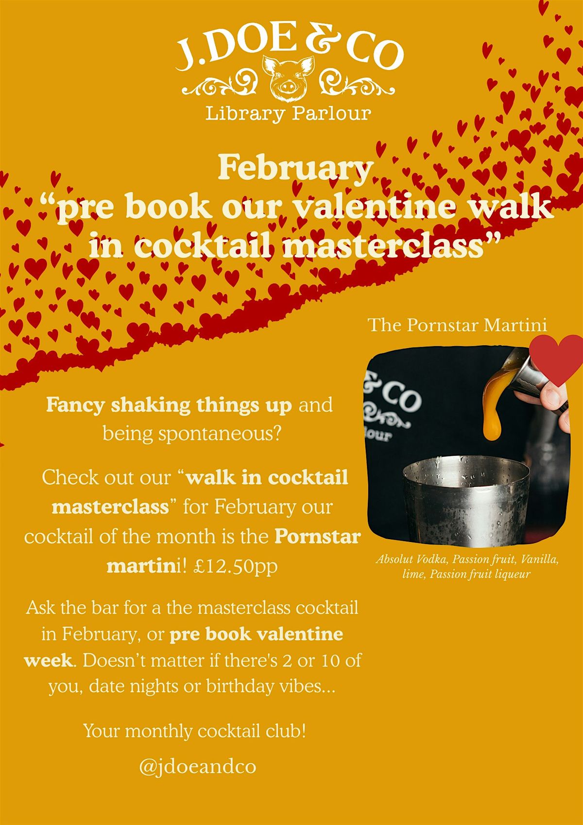 Every month we like you to shaking things up and be a let spontaneous? with our "walk in cocktail masterclasses" but for valentines weekend we're going to let you pre book to avoid disappointment.