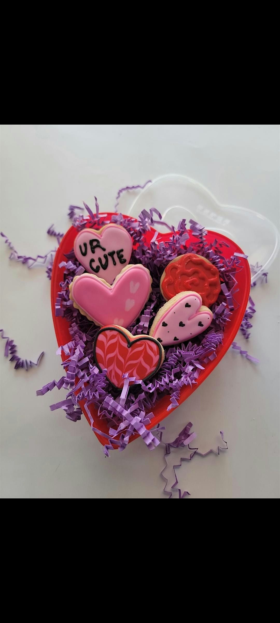 Let's decorate Valentine's cookies together. You'll learn how to create a half doz mini cookies and take them home in a cute gift box.