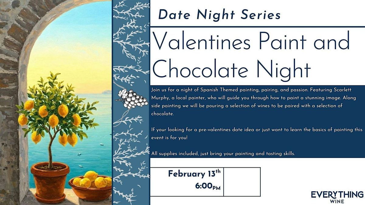 Join us for a night of Spanish Themed painting, pairing, and passion. Featuring (Painters name), a local painter, who will guide you through how to paint a stunning image. Along side painting we will be pouring a selection of wines to be paired with a selection of chocolate.