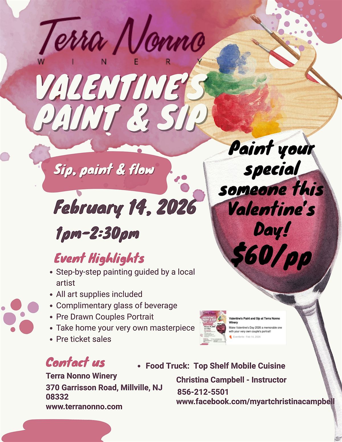 Welcome to Valentine's Paint and Sip at Terra Nonno Winery! Join us on February 14, 2026 at 1:00 PM for a lovely afternoon of painting and sipping wine with your special someone or friends. Let your creativity flow as you enjoy the beautiful surroundings of the winery. No experience needed, just come ready to have fun! Don't miss out on this wonderful Valentine's Day event. See you there!