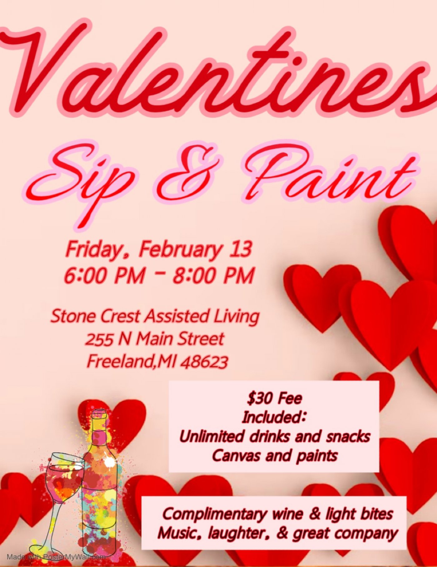If you are interested in participating in our Paint & Sip event for Valentine's Day, please reach out to Ryleigh to RSVP. Ryleigh can be contacted via email at [email protected] or by phone at 989-695-5035.