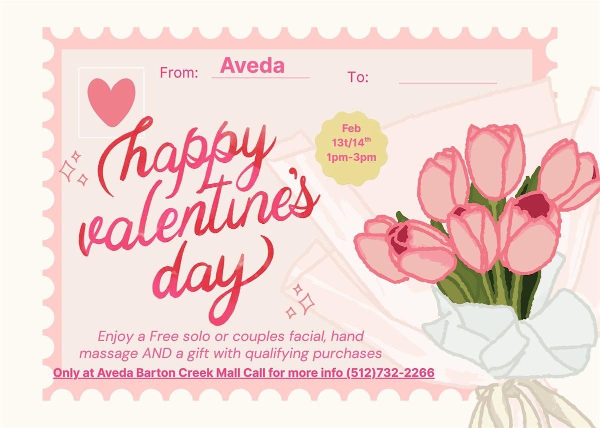 Welcome to the Valentines Self Care Event! Join us at the Aveda Store on February 13th and 14th from 1:00 PM to 3:00 PM for an afternoon of relaxation and pampering. Treat yourself to facials, hand massages, and more to unwind and rejuvenate. Let's celebrate love and self-care together! See you there!