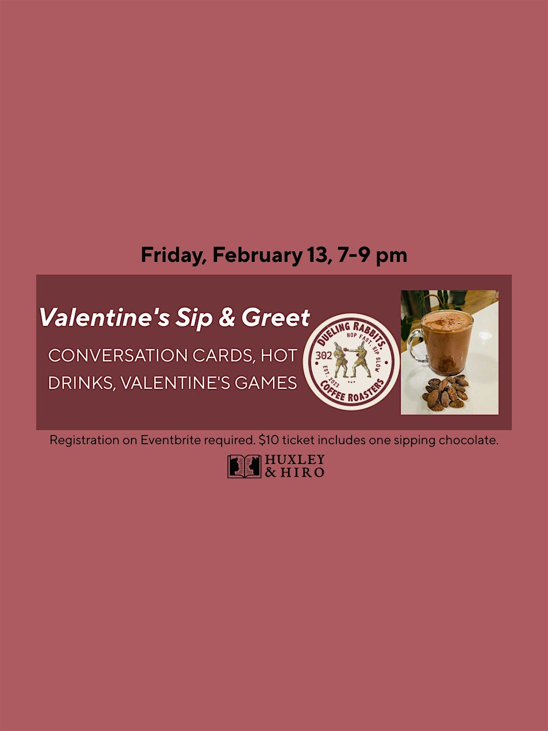 Unlucky in Love? Defy Friday the 13th with a Valentine's Sip & Greet: Come enjoy delicious sipping chocolate and we will introduce you new friends at Dueling Rabbits Cafe and Huxley and Hiro bookstore! Conversation cards, hot drinks, and Valentine's games!