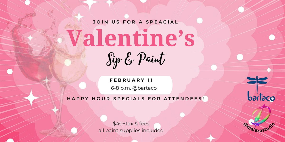 Get ready for a fun-filled night of creativity and good vibes! Join us in person for Valentine's Sip & Paint, where you'll sip your favorite drink while painting a beautiful masterpiece. Whether you're coming solo or with your special someone, it's the perfect way to relax, unwind, and let your artistic side shine. No experience needed—just bring your smile and your love for a great time!
