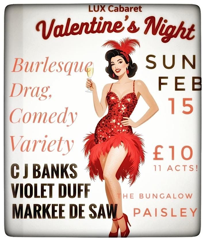 Come join us for a night of glitz and glamour at The Bungalow! Valentines sunday showcases some of the best cabaret talent the UK has to offer, with award winning acts like the incomparable star of vaudeville vocals, Violet Duff, Drag cabaret superstar C.J.Banks, the one and only paramount performer Markee de Saw, and comedy legend Graham Barrie. Our 11 acts also bring classic burlesque and variety to deliver a fabulous night for couples, singles, and groups of pals.