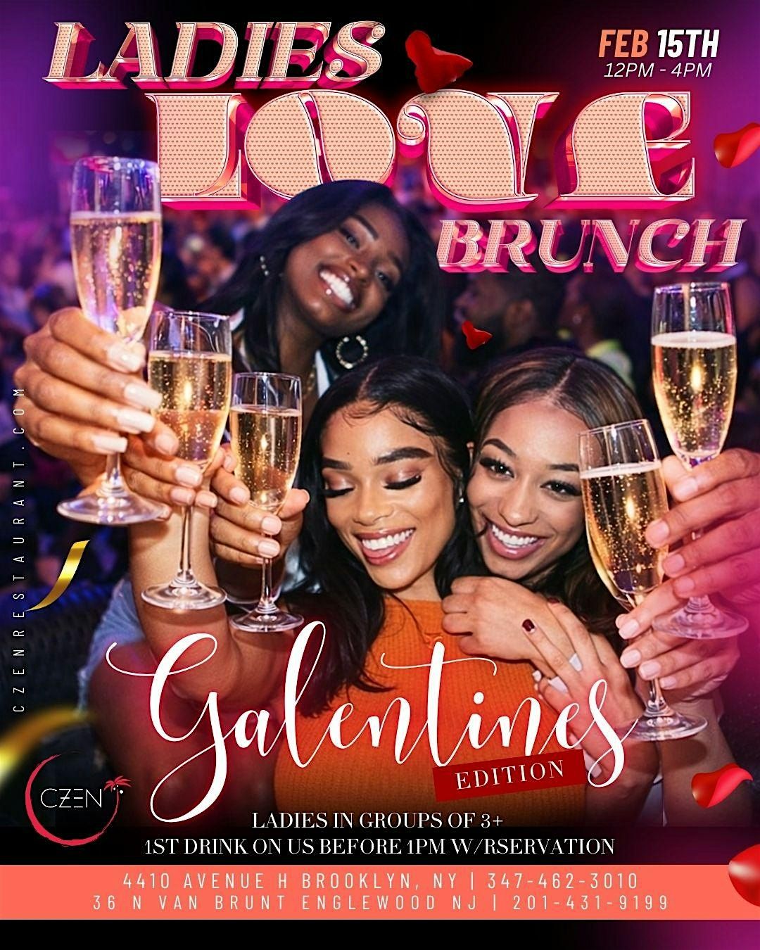 Valentines Day Ladies Love Brunch: Galentines Edition! 1st drink free for groups of 3+ before 1PM at CZEN. Feb 15, 12-4PM.About this Event