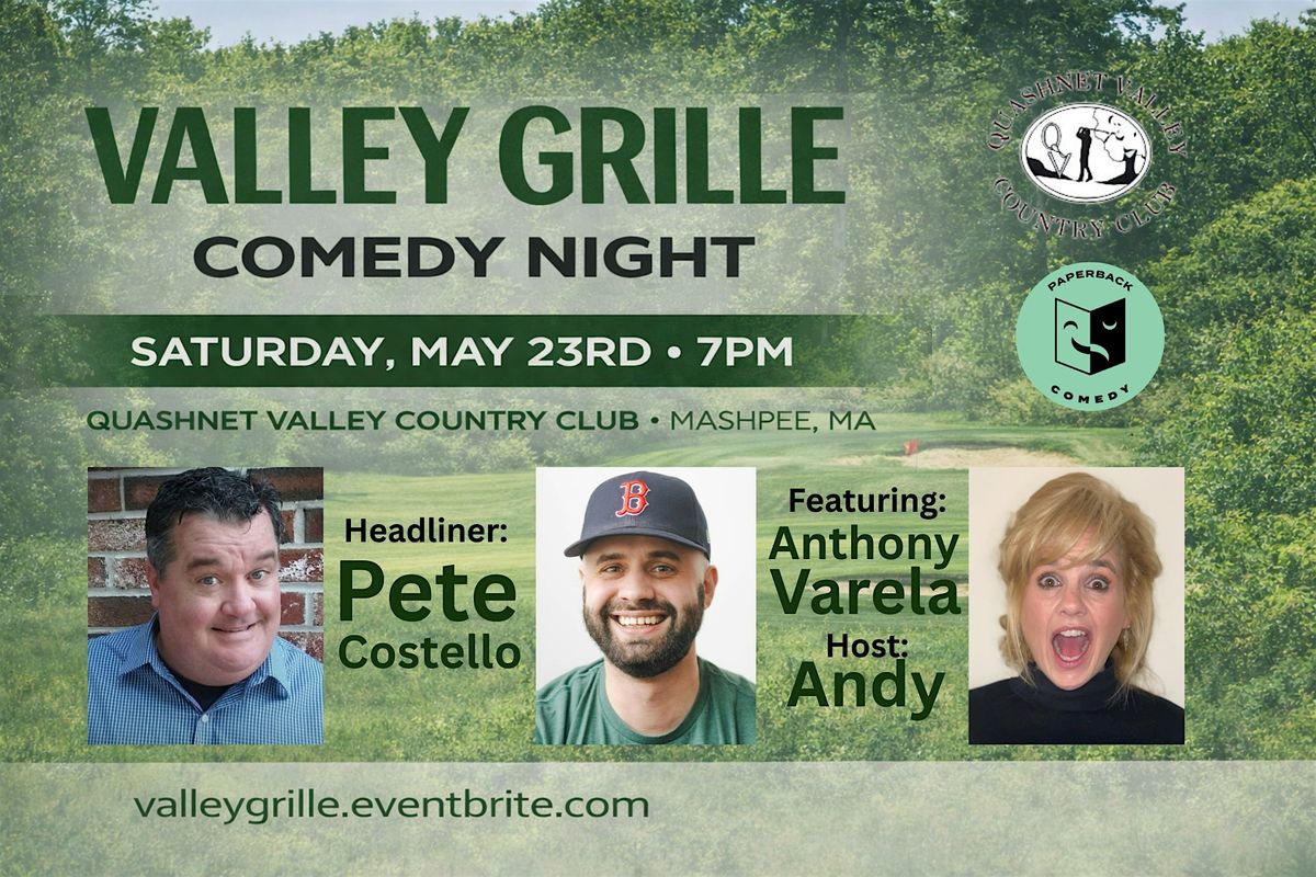 Valley Grille Comedy Night brings a stacked lineup to Quashnet Valley Country Club in Mashpee, featuring headliner Pete Costello (Giggles Comedy Club), with Anthony Varela (aka NobodyCaresAnthony), and hosted by Andy Heckya (The Comedy Factory in RI).