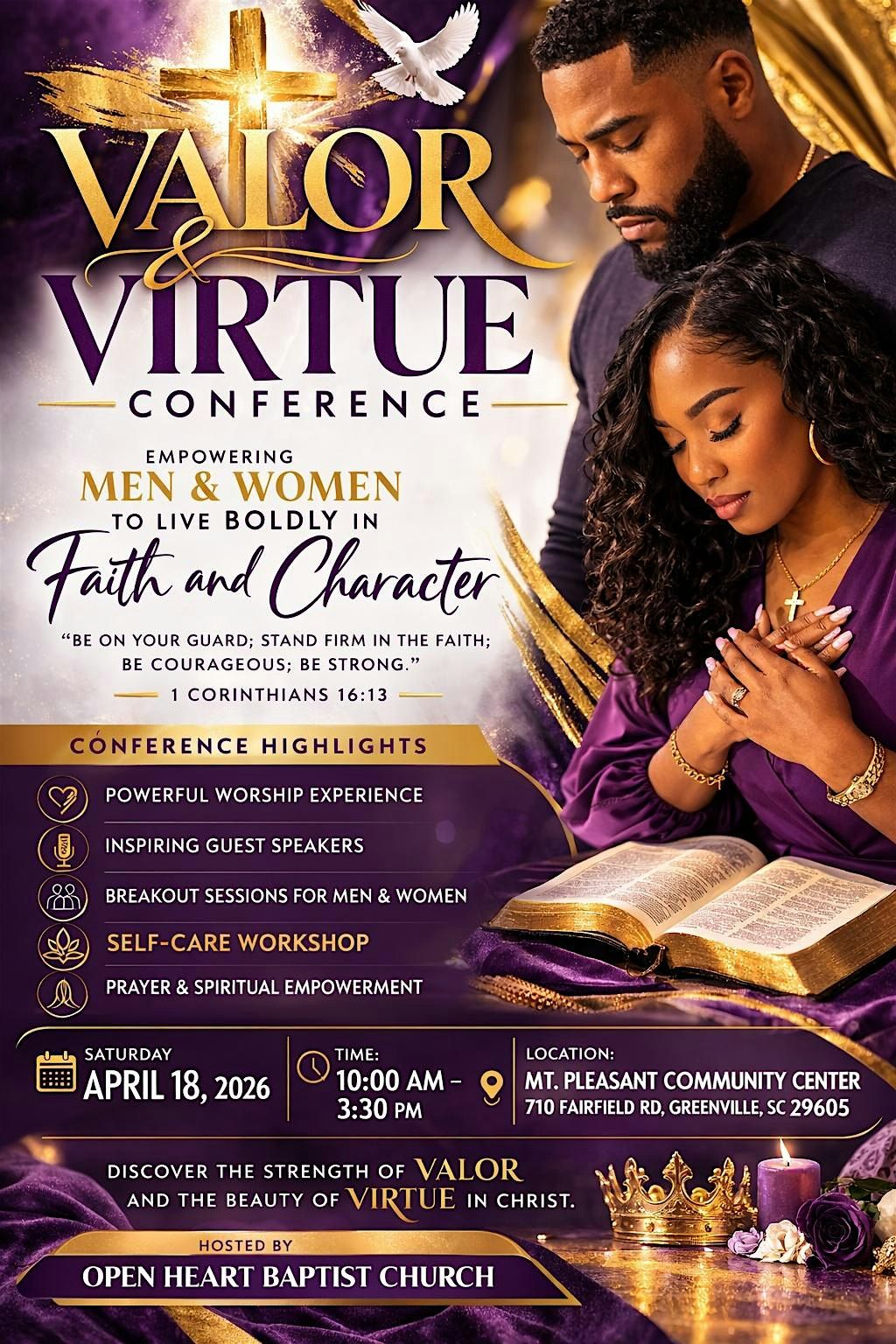 Self care workshop, panel discussions on healing, searching and being Christian. Discussions for single or married while navigating todays views. Raffle giveaway and powerful prayer session. Lunch will be provided