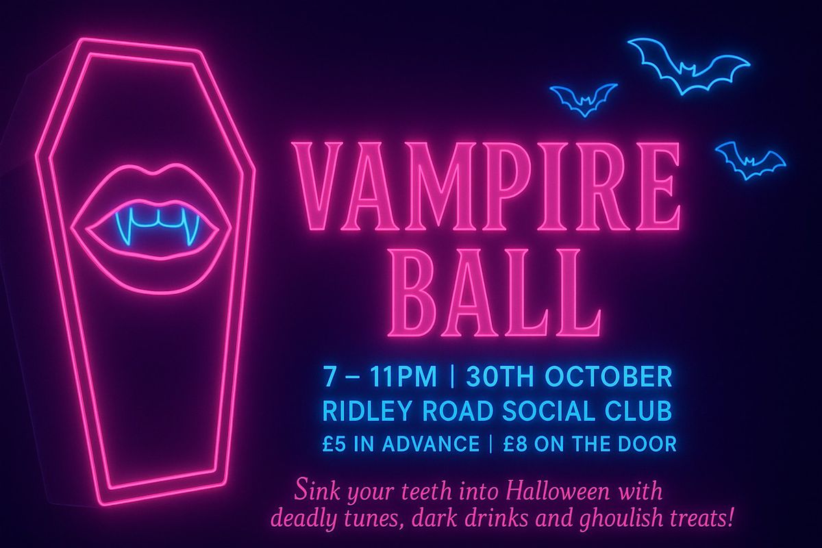 Come join us for a spooktacular night at the Ridley Road Social Club! Get your fangs ready for a Halloween celebration like no other. Dance the night away to the beats of our live DJs as we summon the spirits of the night. Costumes are a must, so bring your best vampire attire and get ready to howl at the moon. Don't miss out on this fangtastic event!