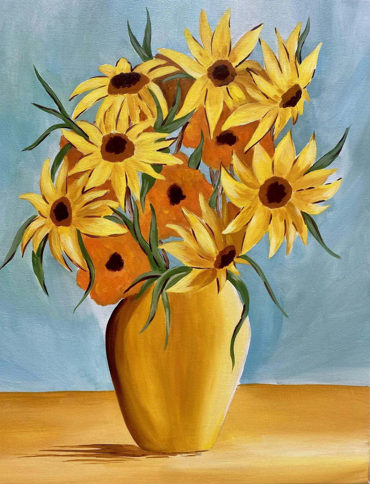 Join us at this Van Gogh Sunflowers paint and sip hosted in the Parrot room at Mozambique- a hidden gem al