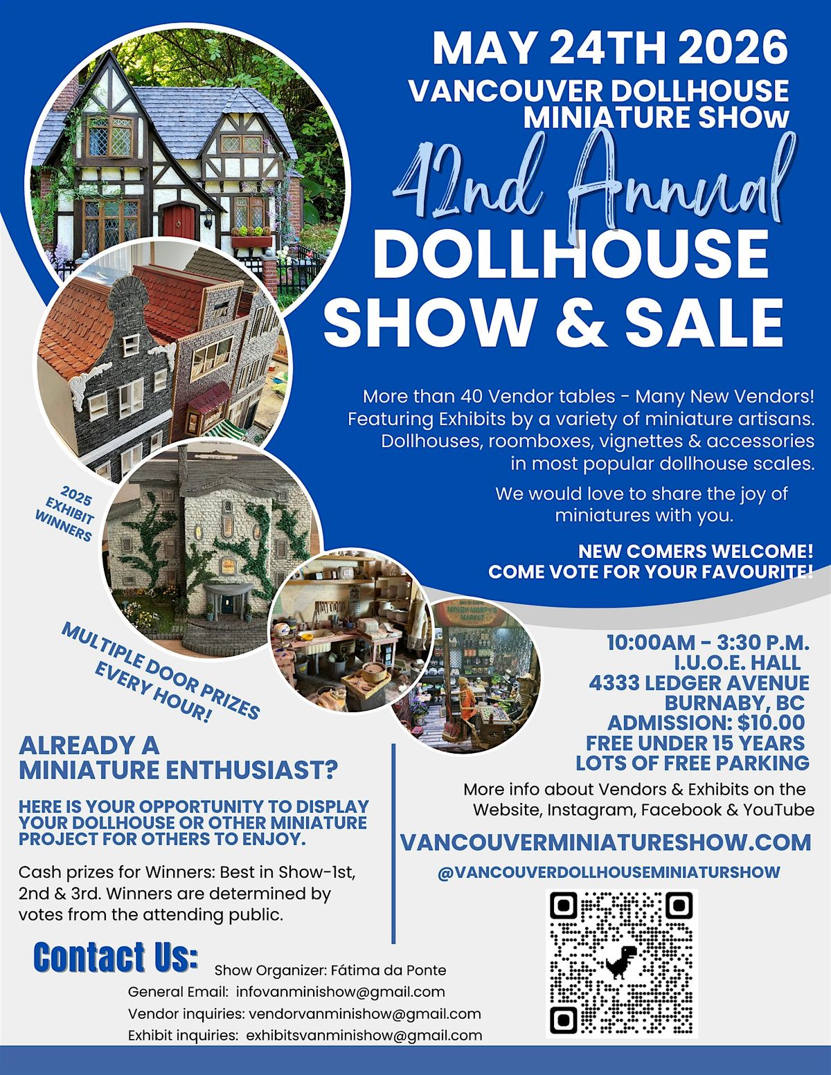 The 42nd annual Vancouver Dollhouse Miniature Show & Sale isSunday, May 24, 2026, from 10 am to 3:30 pm at the I.U.O.E. Hall in Burnaby. Tickets are $10 at the door - under 15 FREE: