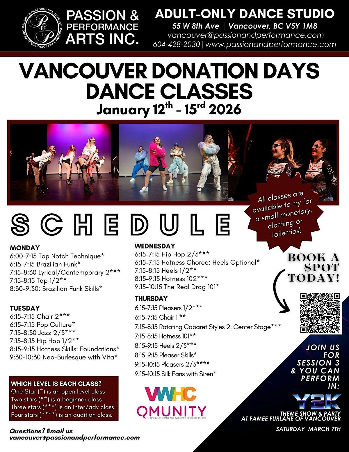 Vancouver’s Adult-Only Dance Studio! Join us January 12-15 for Session 3 Donation Days in Vancouver! All proceeds support QMUNITY & the Vancouver Women’s Health Collective.