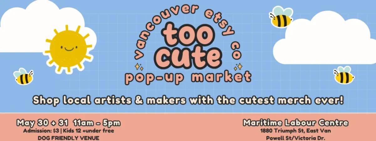 ✨ Round Two. More makers. More cute. More magic. ✨We're back — and we brought more! Too Cute Pop-Up Market returns for its second year at a brand new location: Maritime Labour Centre in East Vancouver, May 30 & 31!A market made for anyone who loves all things adorable — featuring local Canadian makers showcasing the cutest art, stickers, pins, plushies, apparel, home decor, stationery, and more. If you love handmade goodies, support small businesses, or just can't resist something TOO CUTE — this is your weekend.Local Canadian makers & designers showcasing handmade art, stickers, pins, plushies, apparel, home decor, stationery & moreMini Makers on site — young entrepreneurs selling their very own handmade creations 🌟Doodle Booth — drop in, get creative, and make something cute! 🎨Hands-on workshops led by MAMEYO Goods, Radish Designs and Eunoia Naturale. Details TBACome in costume & get a bonus ballot for a chance to win a prize package! ✨Tickets:Workshops price includes admission for the day50% ticket proceeds benefit Backpack Buddies and Quest Non-Profit Grocery MarketsPerks of pre-purchasing your ticket:Skip the line at the door; have your QR code ready, and you'll be a VIP!Every ticket purchased will be entered to win market cash (a draw is triggered for every 100 tickets sold).Workshops: details TBAEunoia NaturaleMAMEYO GoodsRadish Designs🗓️ Sat May 30 + Sun May 31 — 11am to 5pm📍 Maritime Labour Centre, 1880 Triumph St, East Van (near Powell St. & Victoria Dr.)🎟️ Tickets: $3 (good for both days!) | 12 & Under Free🐶 Pet-friendly and fully accessible venue