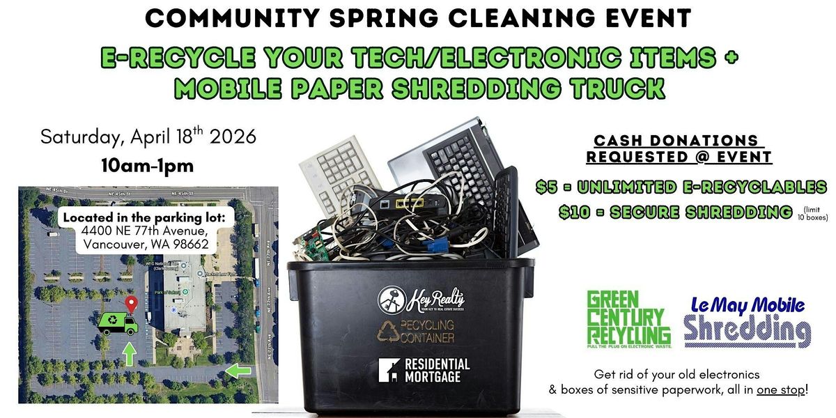 Spring Cleaning Event - Recycle old electronics/tech items & safely shred paperwork, all in ONE STOP, at our 2nd annual Vancouver, WA event.About this Event