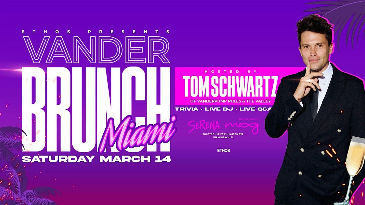 Saturday March 14 - Tom hits MIA! Join HUNDREDS of fans as we eat, sip, dance, and socialize with our closest inside Tampa's boozy brunch headquarters, Serena Rooftop @ Moxy South Beach! This will be the biggest boozy brunch EVER to hit Miami!