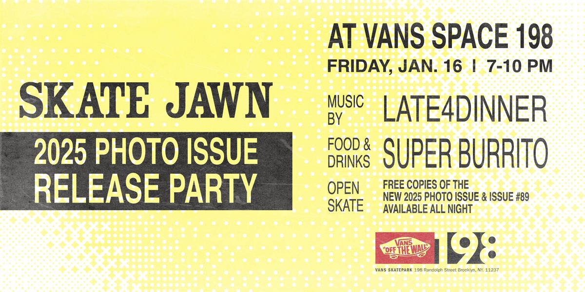 Get ready for a rad in-person jam with Vans and Skate Jawn! We're dropping the 2025 Photo Issue, showcasing killer shots and vibes from the skate scene. Open skate session with food provided Super Burrito. Swing by to check out fresh photos, meet fellow skate fans, and soak up some good times. Don’t miss out on this dope event packed with skate culture and creativity!