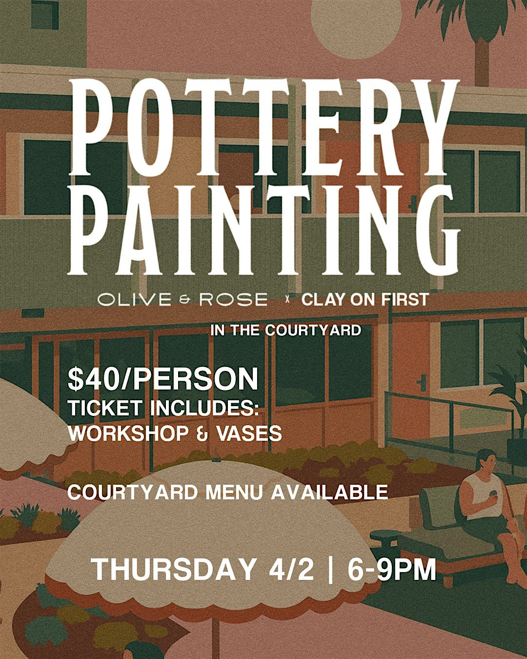 Welcome to Pottery Paint & Sip at Olive & Rose! Join us for a fun-filled evening of creativity and relaxation. Unleash your inner artist as you paint your own pottery masterpiece while enjoying a glass of your favorite drink. This in-person event is the perfect way to unwind and socialize with friends or meet new people who share your love for art. No experience is necessary - our expert instructors will guide you every step of the way. Come sip, paint, and create memories that will last a lifetime!