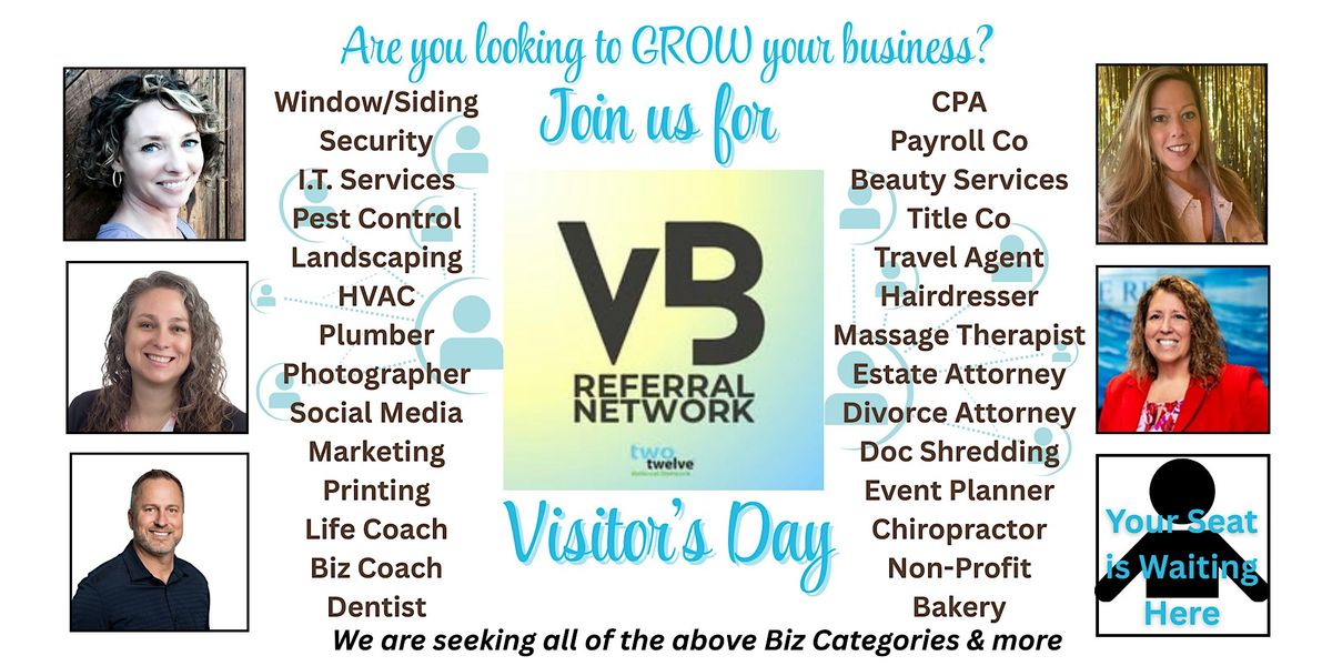 Are you a small business owner and/or sales professional looking to grow your business? If so, we'd love to have you join us for the VB Referral Network's (A team of the TwoTwelve Network) quarterly Visitor's Day.