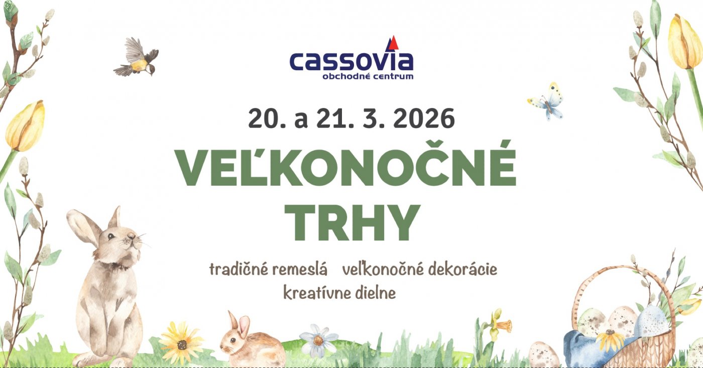 OC Cassovia vás pozýva na Veľkonočné trhy, ktoré sa uskutočnia 20. a 21. marca 2026 od 9:00 do 18:00. Návštevníci sa môžu tešiť na tradičné remeslá, veľkonočné dekorácie a originálne výrobky od lokálnych tvorcov, ktoré prinesú pravú jarnú a sviatočnú atmosféru.