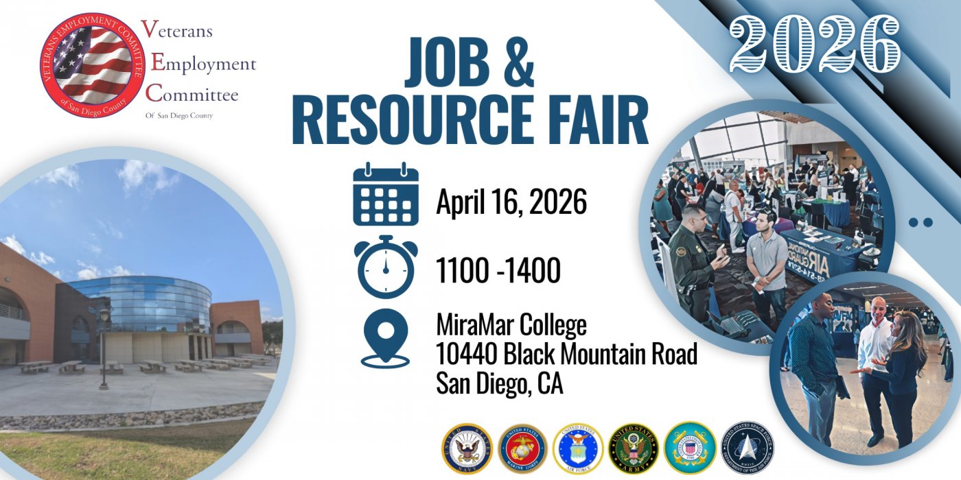 The Veterans Employment Committee of San Diego County Job & Resource Fair will be held on Thursday April 16, 2026 at Miramar College in beautiful Mira Mesa. The Job Fair will be located at the Veterans Lifestyle & Design Center and we are expecting over 1000 Job-Seekers in attendance. Employers & Resource Providers we only have 50 tables available for this event so we encourage you to register as soon as possible. There are Sponsorship Levels available for $2500, $1500 & $1000, the For Profit Employer fee is a $350.00 the Non Profit and Government Agency fee is $300. 00 Please contact [email protected] for your registration amount.