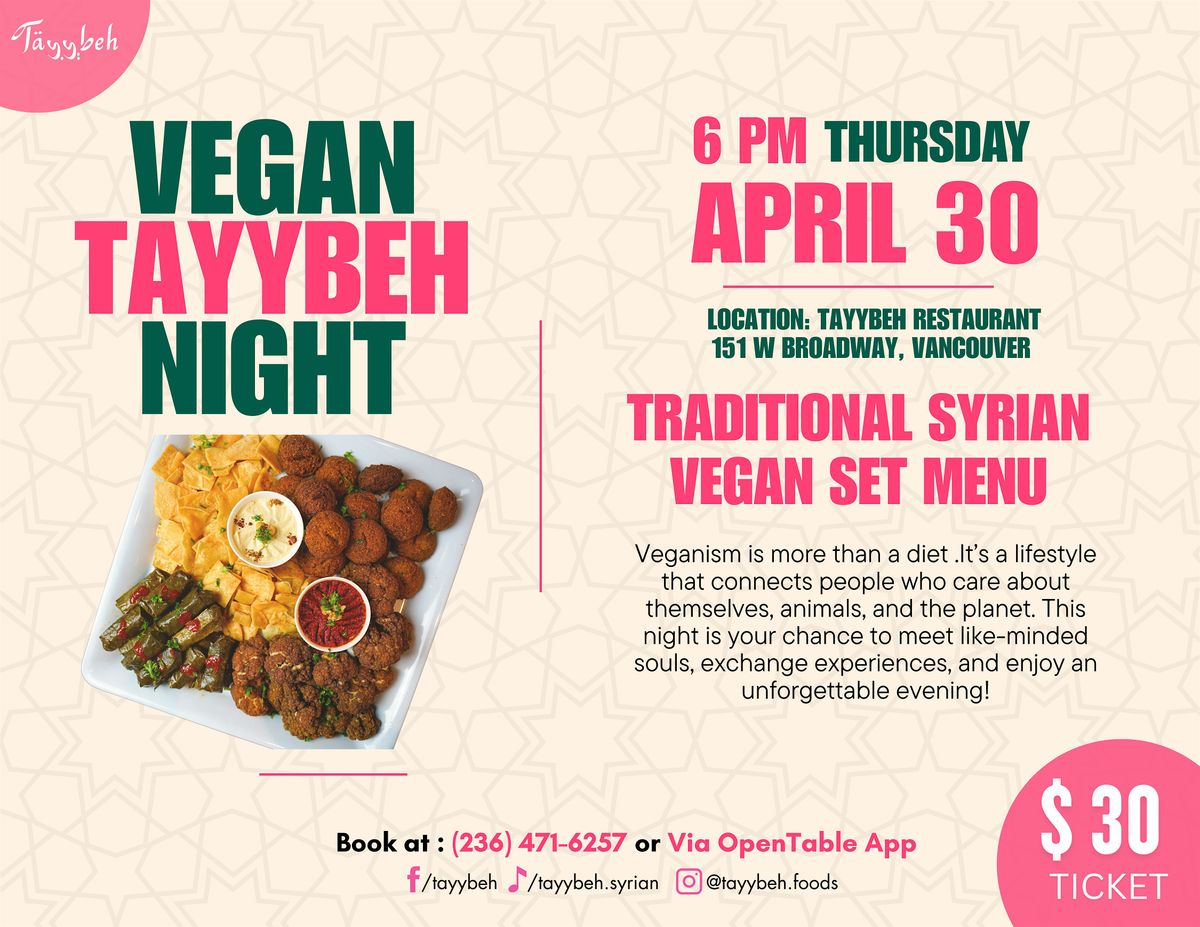 Join us for an unforgettable evening of delicious, plant-based eats at Tayybeh. Whether you're a seasoned vegan or just curious to explore new culinary horizons, this is the perfect chance to connect with a wonderful community over incredible food.