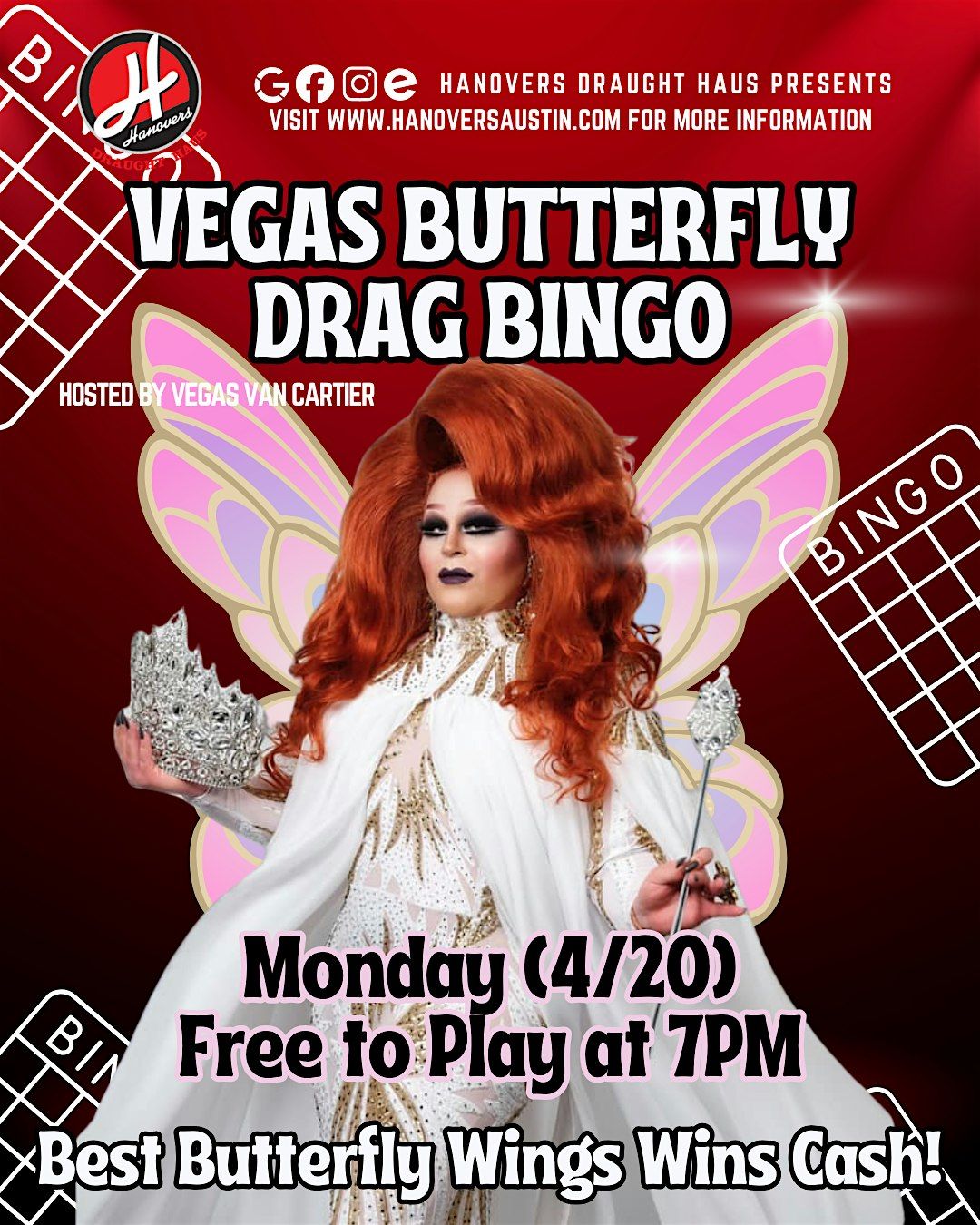 Welcome to Hanovers Drag Bingo Night! We are proud to co-host alongside Ms. Vegas Van Cartier to bring you a safe & pfun LGBTQIA+ event!