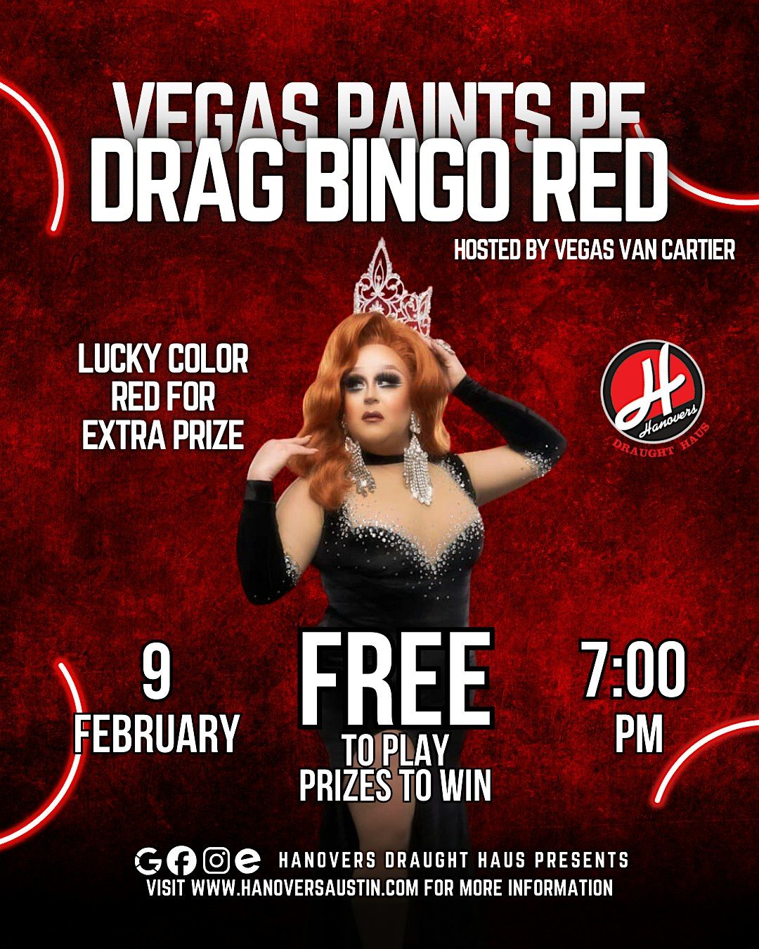 Welcome to Hanovers Drag Bingo Night! We are proud to co-host alongside Ms. Vegas Van Cartier to bring you a safe & pfun LGBTQIA+ event!