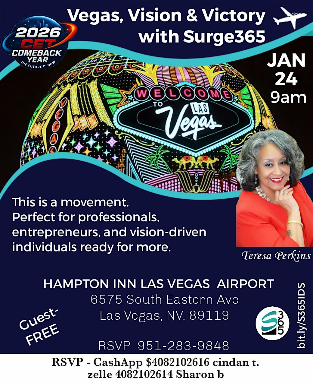 This is an invitation for a personal invite to be our VIP Guest! Join us in Las Vegas for Vegas, Vision & Victory with Surge365, an inspiring business presentation designed to connect, encourage, and expand vision for those ready to explore what’s possible in 2026 and beyond. We will be exploring one of the largest industry in the Nation. Travel and your ability to leverage and create your own economy.