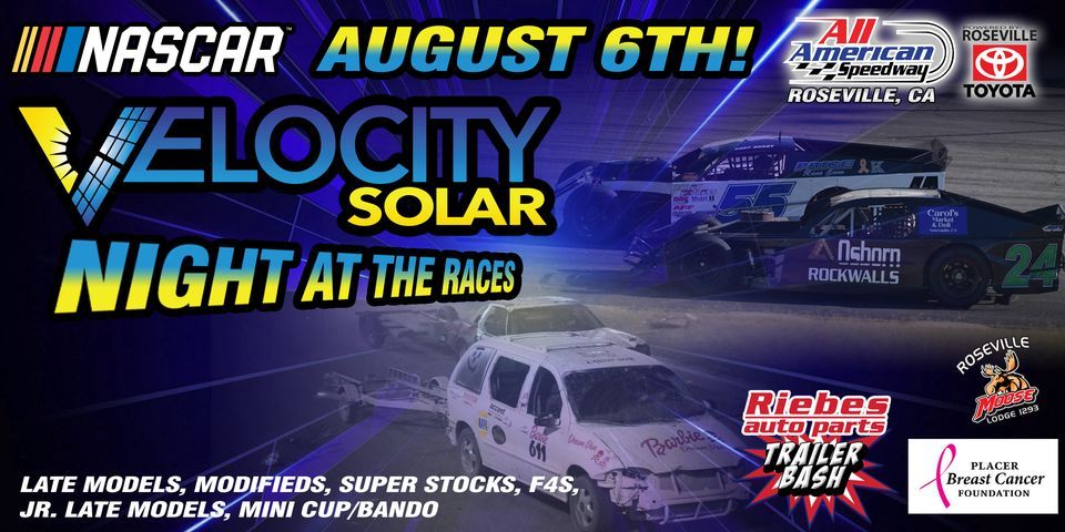 Saturday night August 6th is Velocity Solar Night at the Races featuring the final Riebes Auto Parts Trailer Bash of 2022! Don’t miss a full night of NASCAR action including the Berco Redwood Late Models, Foothills Tow Modifieds, Riebes Auto Parts Super Stocks, F4s, Jr. Late Models, and Mini Cup/Bandos racing. First 100 kids through the gates will receive a special back to school activity from NASCAR. Event benefits the Placer Breast Cancer Foundation!General Admission: $20.00