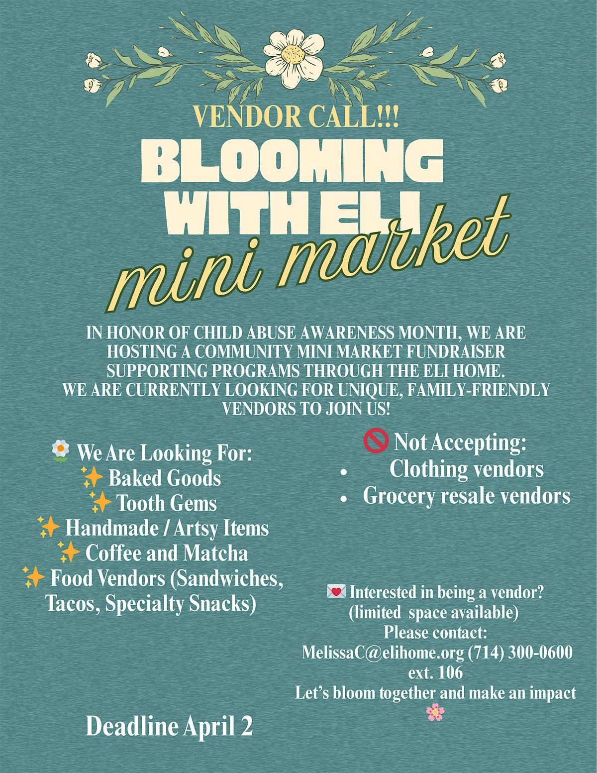Join us for Blooming with ELI, a special community event in honor of Child Abuse Awareness Month. This event is all about bringing people together to support healing, creativity, and connection β because when a community comes together, healing can bloom.