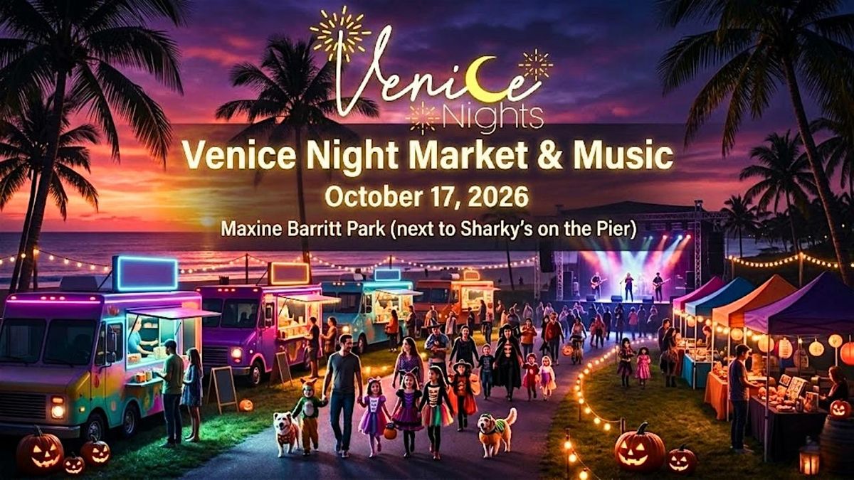 Venice Night Market & Music is back on October 17, 2026 at Maxine Barritt Park—right next to Sharky's on the Pier—for a special Halloween edition you won’t want to miss.