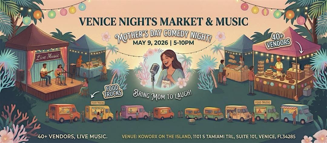 Celebrate Mother’s Day weekend early at Venice Nights Market & Music on May 9 at Koworx on the Island. Enjoy 40+ vendors, food trucks, live music, and a featured comedy show in a fun, family-friendly setting. Bring your mom, bring your friends, and enjoy a night of shopping, food, and laughs in Venice, Florida.