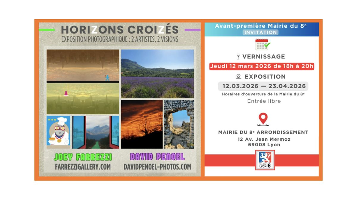 L’exposition « Horizons Croizés » aura lieu à l’Atrium à la Mairie du 8e du 12 mars au 23 avril 2026, sur les horaires d'ouvertures de la Mairie du 8e.