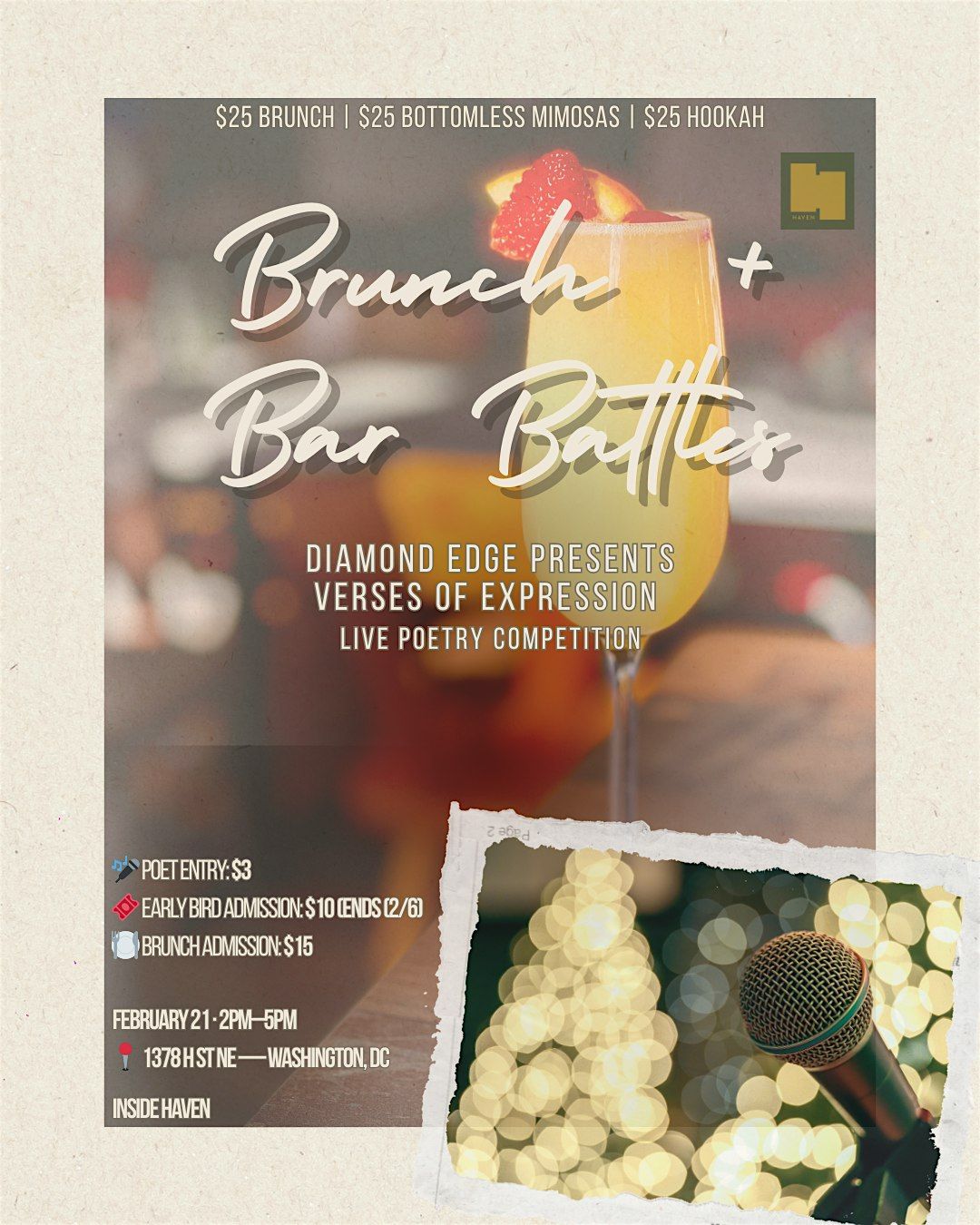 Join us for an unforgettable afternoon at HAVEN as Diamond Edge proudly presents "Verses of Expression" Live Poetry Competition! Experience the vibrant atmosphere on February 22 from 2 PM to 5 PM, where creativity and culinary delights collide.