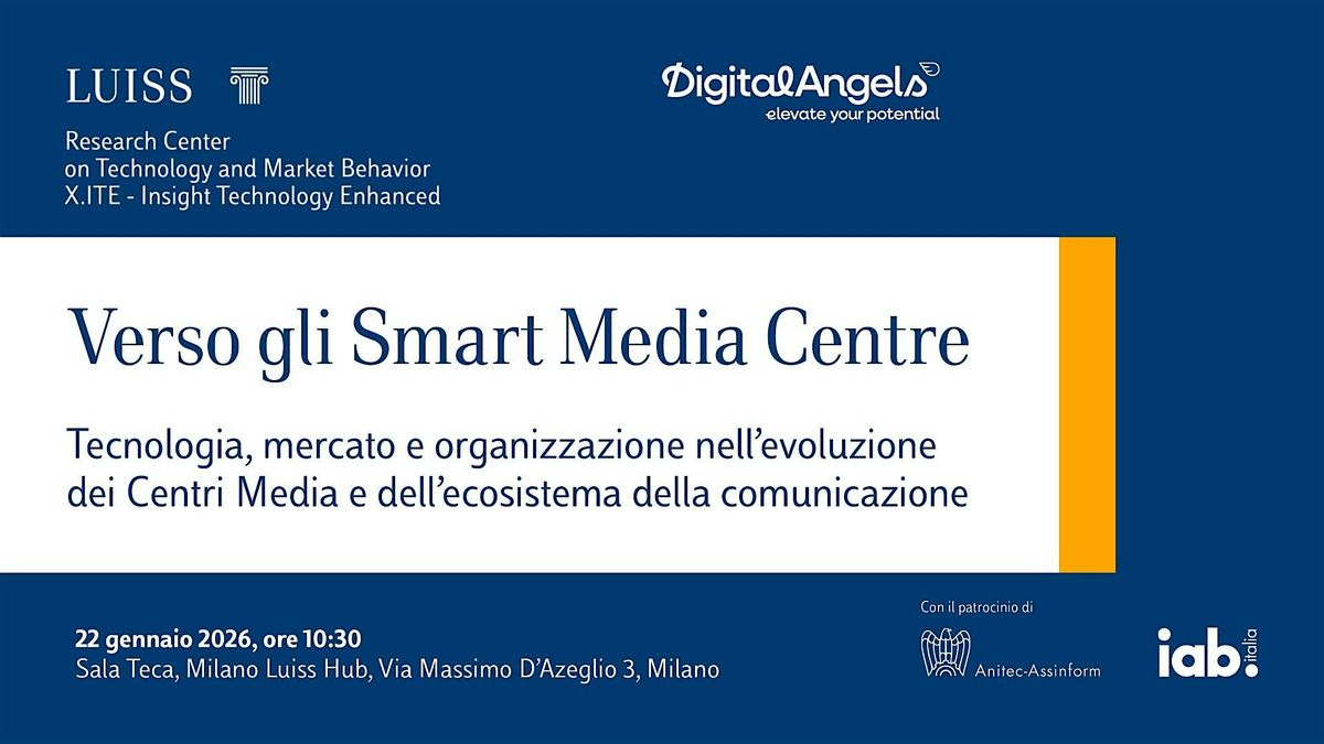 Partecipa alla conferenza “Verso gli smart media centre. Tecnologia, mercato e organizzazione nell’evoluzione dei Centri Media e dell’ecosistema della comunicazione”, in programma per giovedì 22 gennaio alle ore 10:30, presso la sede di Luiss Hub in via Massimo D’Azeglio 3, Milano.