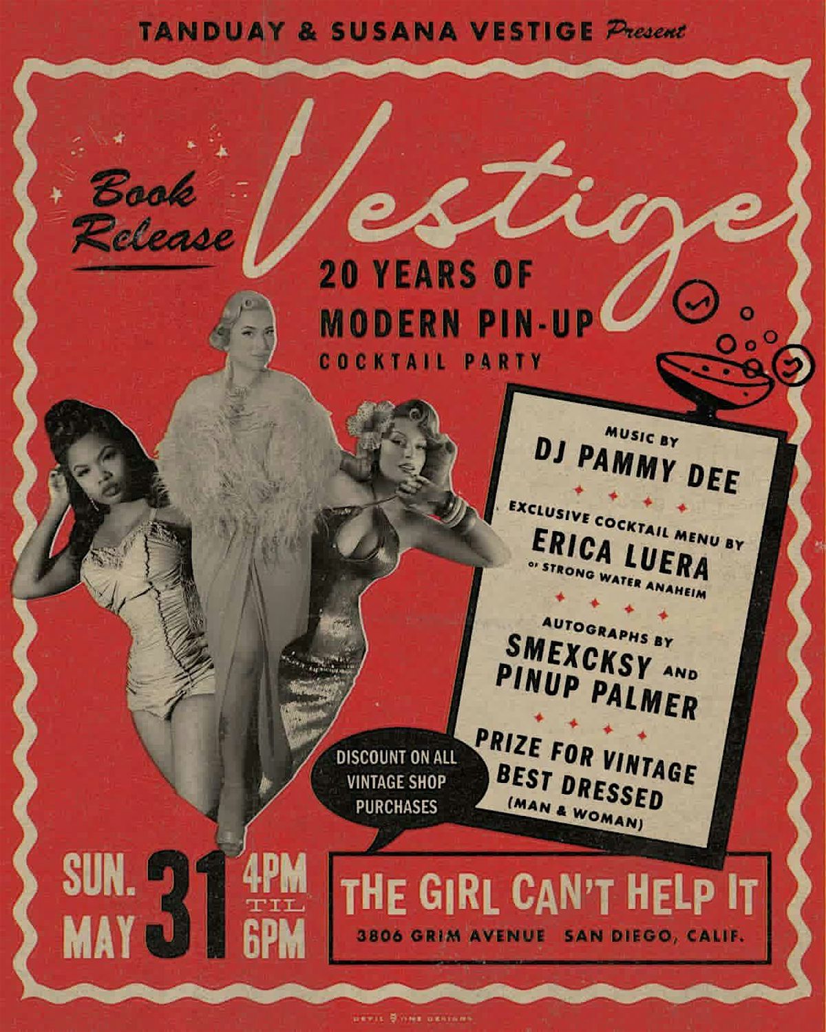 We are gathering to celebrate the release of Vestige: 20 Years of Modern Pinup coffee book. It is a 20 year retrospective of Susana Vestige worldwide vintage photoshoots. Inside the book you'll find classic cars, lavish vintage and mid century modern interiors, tiki bars and cocktail recipes, as well as an inside look into the trajectory of the pinup lifestyle written by Susana who saw it all happen firsthand.