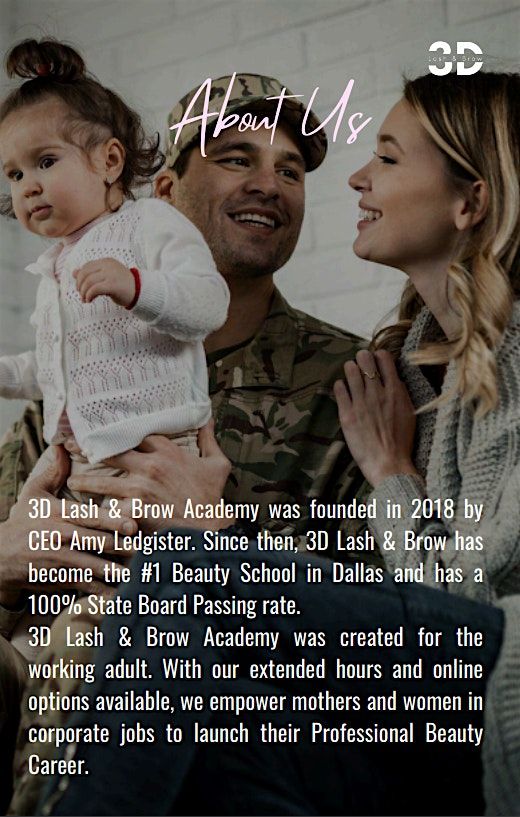 - Affordability. Low Tuition Cost. VA and tuition assistance benefits often cover the full cost of attending 3D Lash & Brow. We also offer a Military Scholarship (open to active-duty servicemembers, veterans, their spouses, and their children).