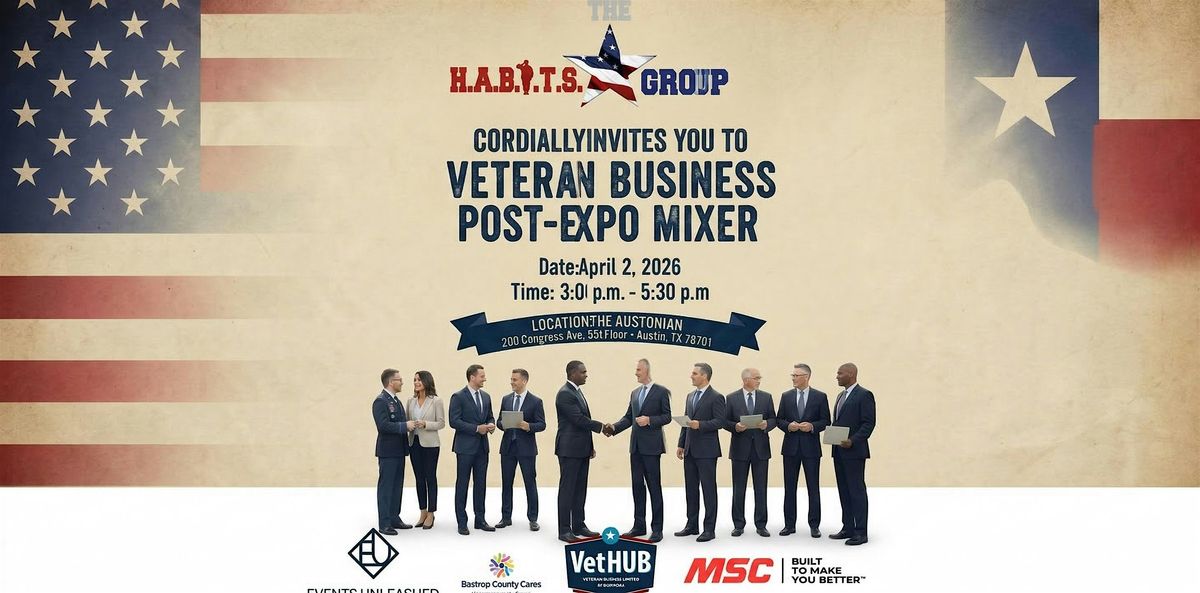 The H.A.B.I.T.S. Group is hosting the first ever Veteran Business Post-Expo Mixer from 3:00 to 5:30 PM at The Austonian, 55th Floor, 200 Congress Ave, Austin TX 78701. Full venue access begins at 2:30 PM. This is the perfect chance to connect with fellow veterans and business professionals, build serious relationships, and be part of a night dedicated entirely to supporting veteran-owned businesses. Good vibes, great conversations, and real opportunity. Come hang with us and let's make this one for the books.