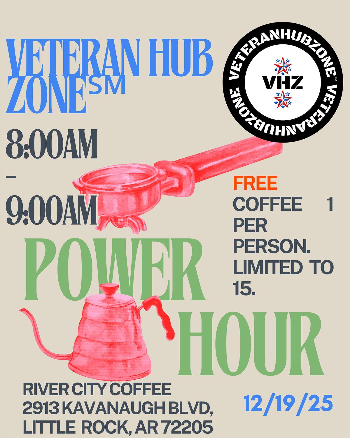 Step into the Veteran Hub Zone Power Hour at River City Coffee, where resilience drives collaboration. The first 15 attendees get free coffee as the community shares updates and connects with veterans. Join us for focused conversation, meaningful connections, and to activate human capital for growth.