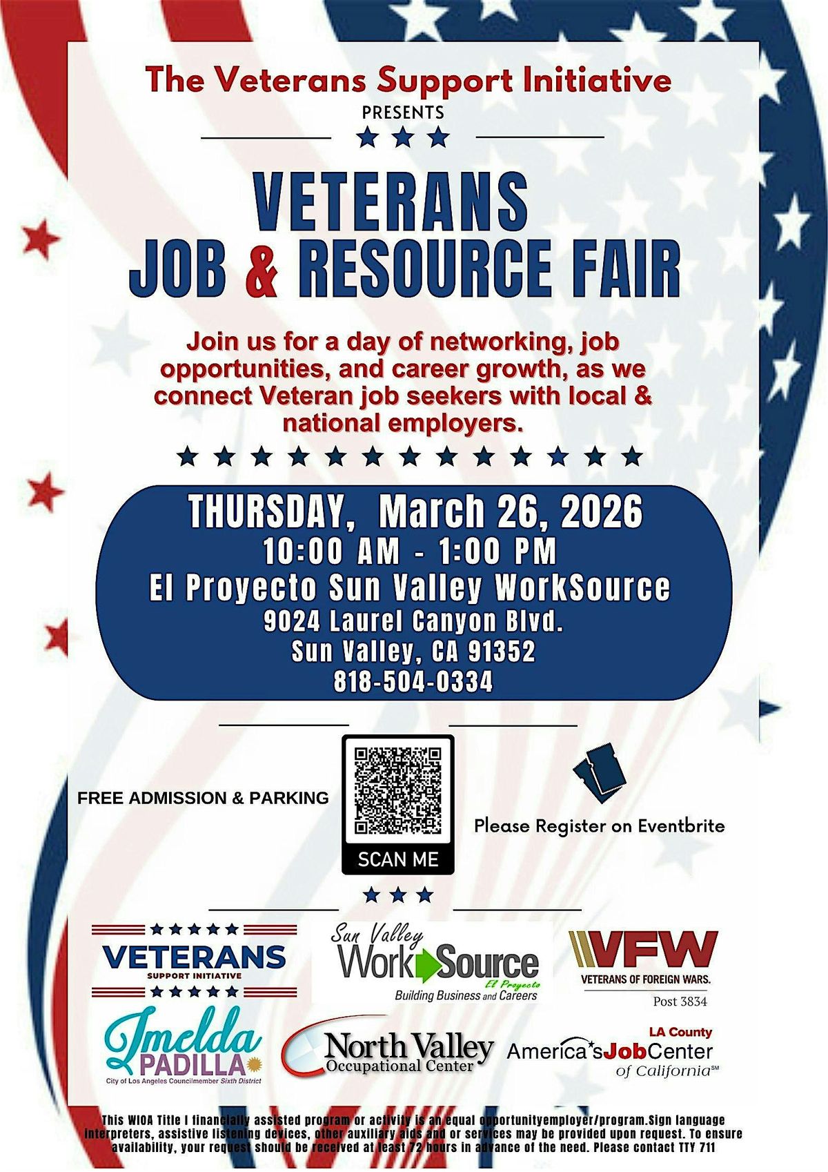 Looking for your next career opportunity? Look no further! The Veteran Job Fair at Sun Valley WorkSource Center on March 26th from 1000 am to 100 pm has got you covered. Discover various job openings with new job opportunities being added regularly, this is a Veteran event you don't want to miss. Hosted by the Veteran Support Initiative, this fair promises to be the ultimate Veteran job-hunting experience!