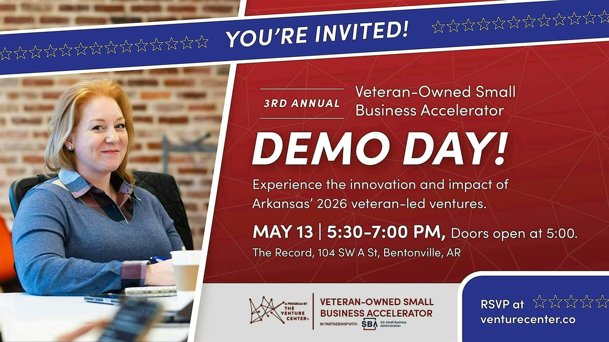 Join us on Wednesday, May 13, at The Record in Bentonville for our third Veteran-Owned Small Business Accelerator Demo Day.. Doors will open at 5:00 PM, and the program will begin promptly at 5:30 PM. This special evening will showcase the 2026 cohort of veteran entrepreneurs from Arkansas. They will share their journeys, present their ventures, and discuss how their military backgrounds continue to influence their impact in the business world. This is a unique opportunity to hear directly from the founders, learn about their companies, and connect with leaders in the region who support veteran-owned businesses. We hope you will join us in celebrating innovation, service, and the next generation of veteran-led ventures in Arkansas.