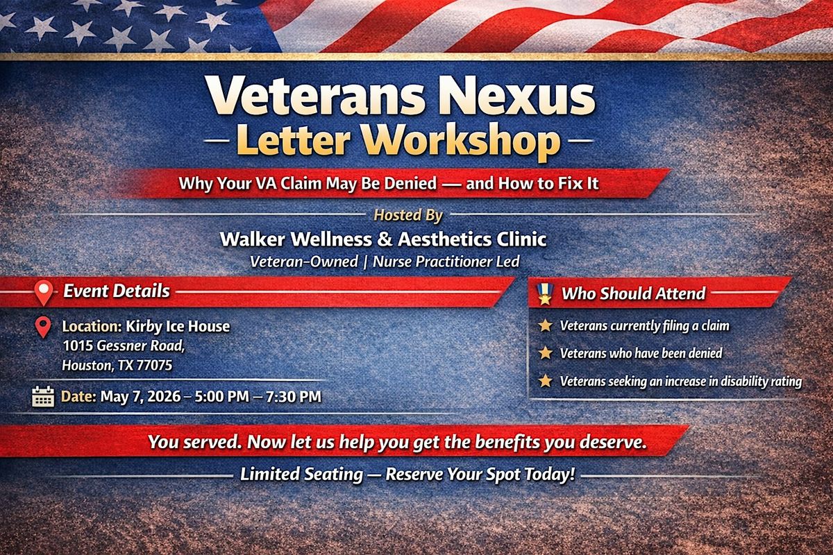 Join Walker Wellness & Aesthetics Clinic, a veteran-owned and Nurse Practitioner-led clinic, for an informative and empowering workshop designed to help you better understand the VA claims process.