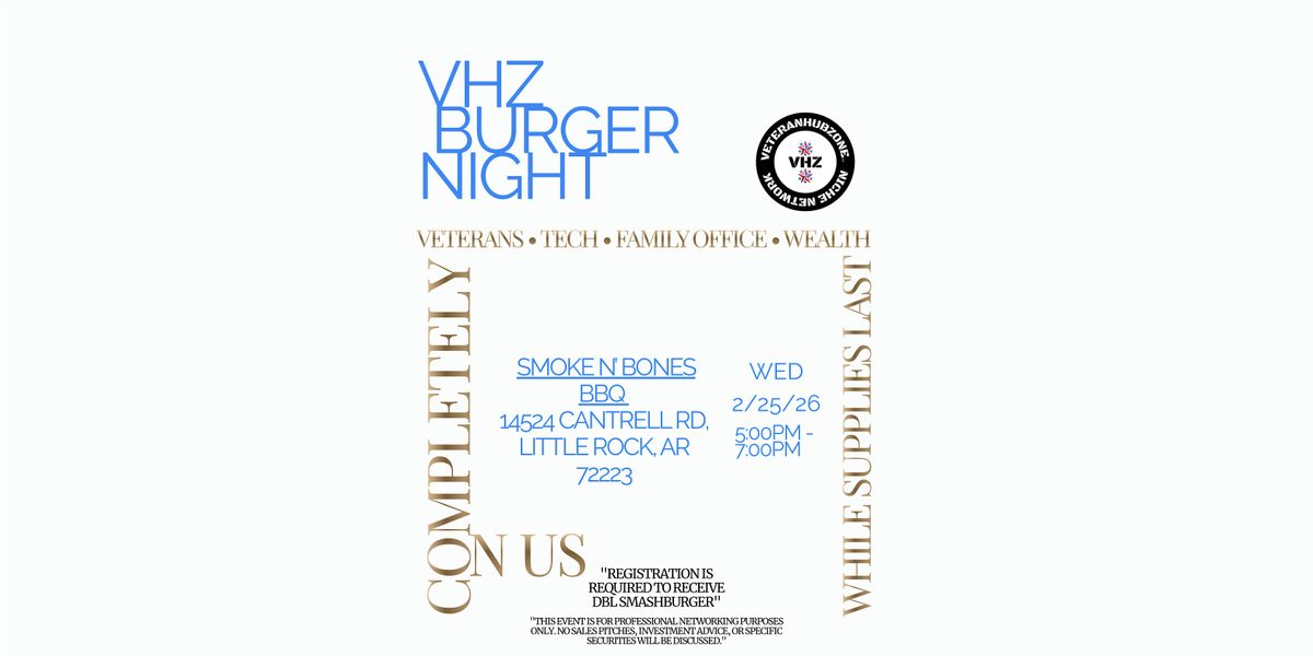 "The Veteran Hub Zone℠ Burger Night is for networking and peer-to-peer dialogue only. It does not provide investment, legal, professional or tax advice." "This event is for professional networking purposes only. Also, no sales pitches, investment advice, or specific securities will be discussed."See V